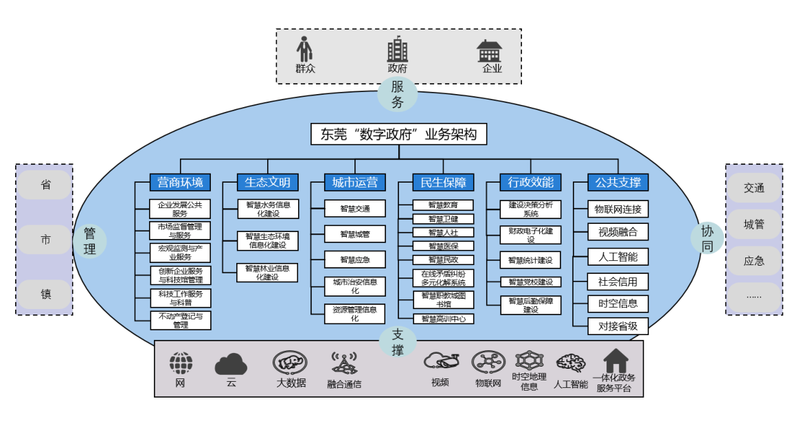 東莞市“數(shù)字政府”建設(shè)突破傳統(tǒng)業(yè)務(wù)條線垂直運(yùn)作、單部門內(nèi)循環(huán)模式,以管理、服務(wù)、協(xié)同和支撐為職能線,以營商環(huán)境、生態(tài)文明、城市運(yùn)營、民生保障、行政效能和公共支撐為業(yè)務(wù)線,構(gòu)建縱橫貫通的整體型“數(shù)字政府”業(yè)務(wù)體系。業(yè)務(wù)架構(gòu)圖如下所示: