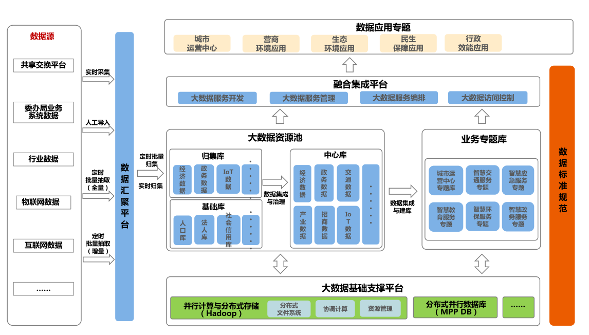 依托統(tǒng)一的數(shù)據(jù)標(biāo)準(zhǔn)規(guī)范,從數(shù)據(jù)采集、數(shù)據(jù)匯聚、集成治理、數(shù)據(jù)存儲到數(shù)據(jù)開放共享和數(shù)據(jù)服務(wù),建設(shè)完整的大數(shù)據(jù)架構(gòu)體系,實(shí)現(xiàn)數(shù)據(jù)全生命周期的管理,支撐大數(shù)據(jù)的業(yè)務(wù)應(yīng)用。
