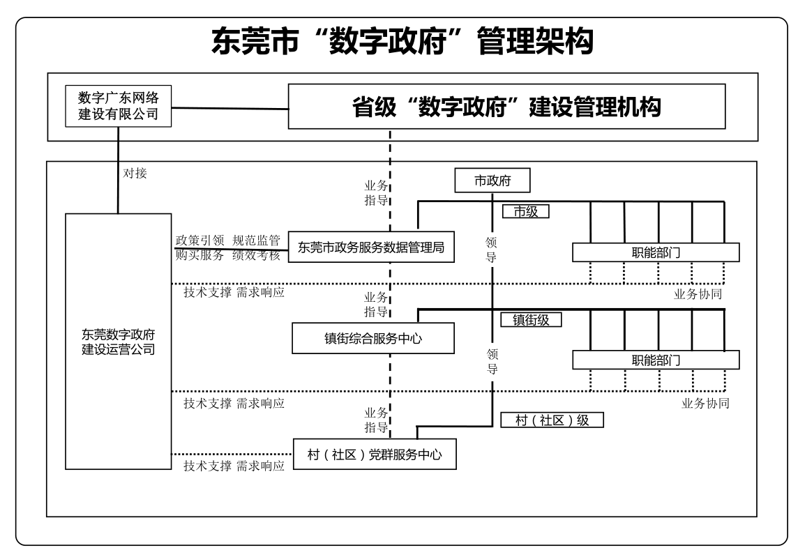 按照“管運(yùn)分離”的總體原則,在管理機(jī)制、運(yùn)行機(jī)制、建設(shè)運(yùn)維模式等方面進(jìn)行探索創(chuàng)新,在全省“數(shù)字政府”改革建設(shè)組織管理體系框架下,構(gòu)建“統(tǒng)一領(lǐng)導(dǎo)、上下銜接、運(yùn)作高效、統(tǒng)籌有力、整體推進(jìn)”的東莞市“數(shù)字政府”管理體系。