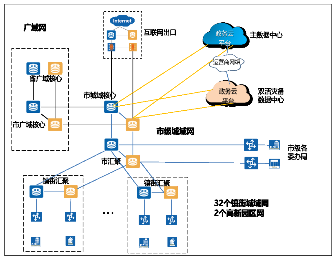 市政務(wù)外網(wǎng)通過市廣域核心節(jié)點(diǎn)向上聯(lián)接省廣域核心節(jié)點(diǎn),通過市城域核心節(jié)點(diǎn)聯(lián)接政務(wù)云中心和互聯(lián)網(wǎng)出口區(qū),再通過市匯聚節(jié)點(diǎn)聯(lián)接市級各委辦局網(wǎng)絡(luò)和鎮(zhèn)街匯聚節(jié)點(diǎn)。市城域核心、市匯聚、鎮(zhèn)街匯聚設(shè)備作為政務(wù)外網(wǎng)骨干設(shè)備,應(yīng)具備大容量,高性能,良好的擴(kuò)展性,支持 MPLS VPN、SRV6、SDN 等新技術(shù)。