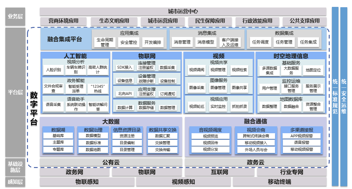 技術(shù)實(shí)現(xiàn)以數(shù)字平臺為核心,提供包括云計算、大數(shù)據(jù)、時空信息服務(wù)、視頻云、融合通信、物聯(lián)網(wǎng)、人工智能等能力,統(tǒng)一由能力開放平臺進(jìn)行服務(wù)發(fā)布和接口管理。